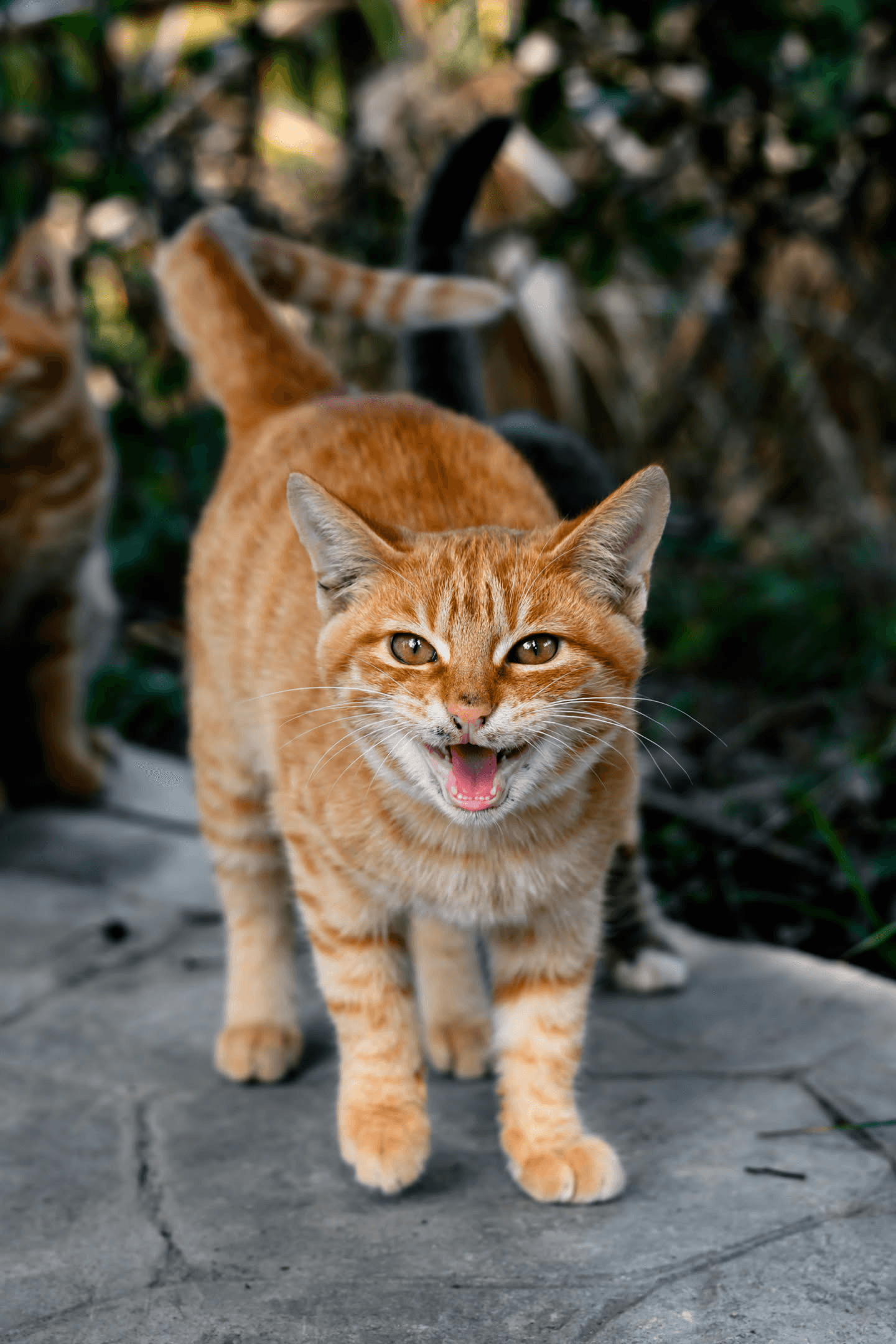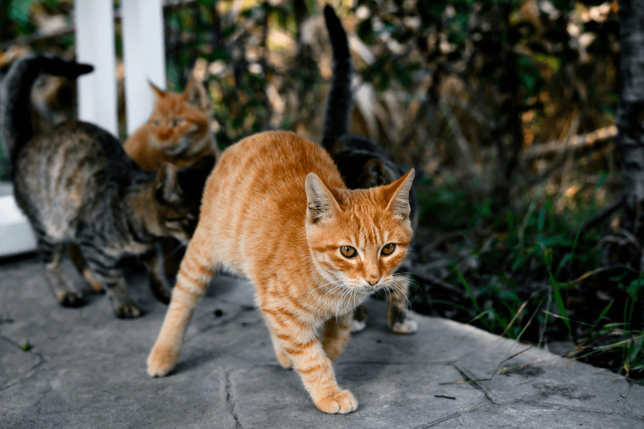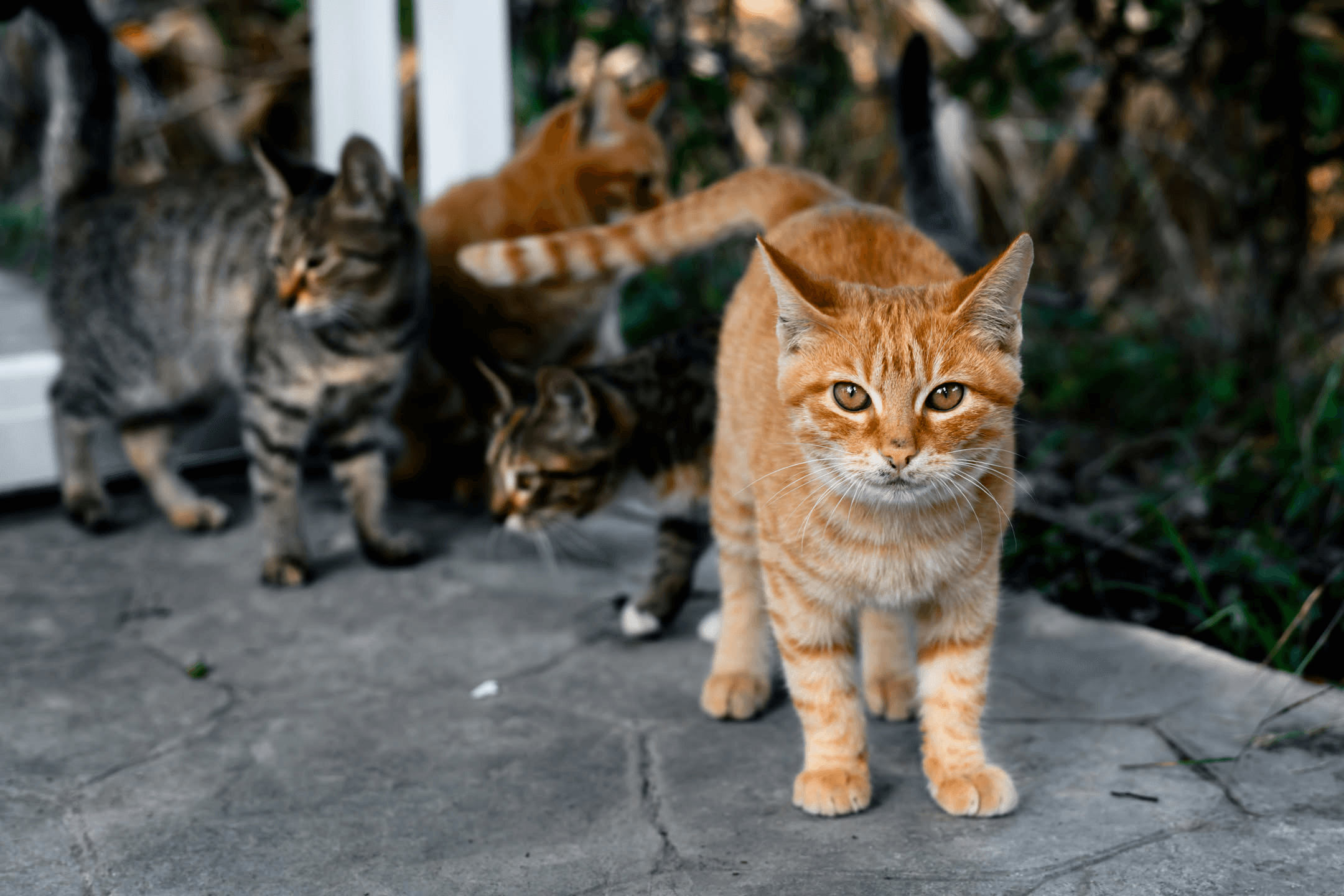 三只橘猫和两只狸花组成的猫咪家族。